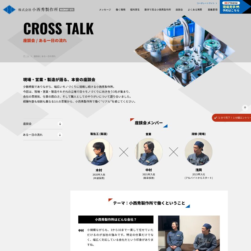 コーポレートサイトとは印象を切り替え、真面目さとアットホームさが伝わる採用サイトを目指しました。働く環境を丁寧に伝える構成に加え、座談会ページでは社員の方の本音が伝わるように工夫し、安心して応募できる設計としています。また、30分見学予約の設置や1分間エントリーのバナーなど、応募のハードルを下げることで行動につながりやすいサイトに仕上がったと思います。