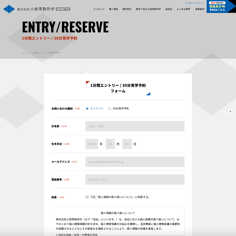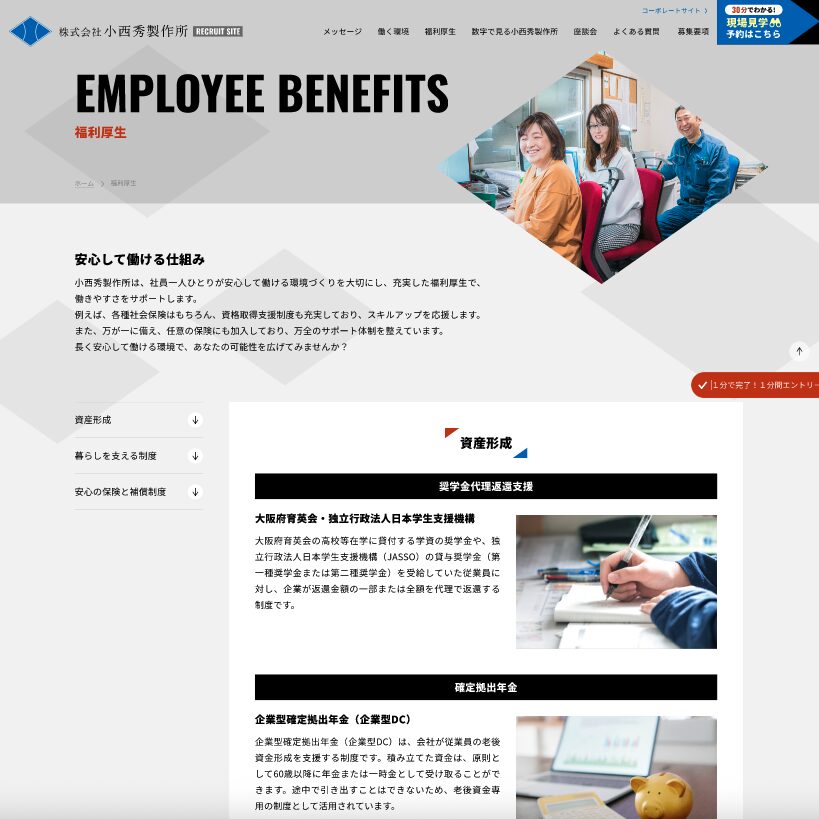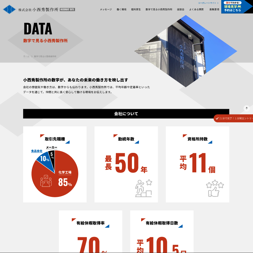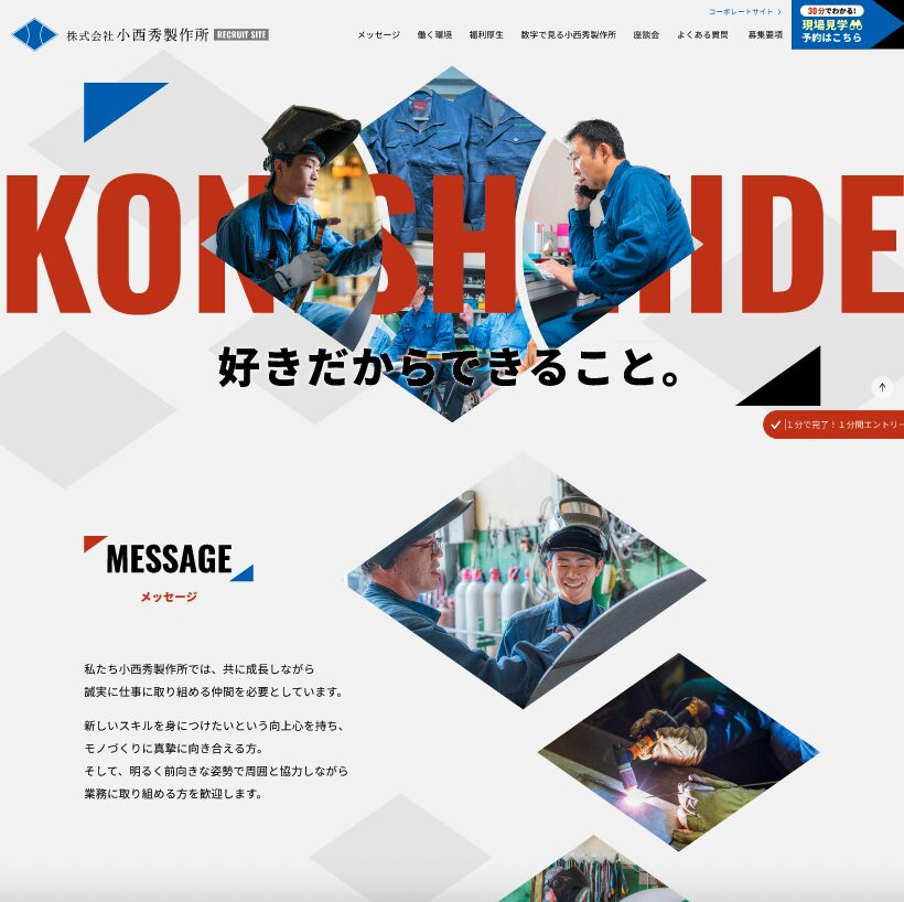 採用情報(HOME)、募集要項、働く環境、座談会、数字で見る小西秀製作所、福利厚生、よくある質問、1分間エントリー、30分見学予約